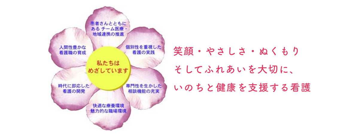 私たちは新型コロナウイルス感染症の対応に迫られ今までにない経験をしてきました。この状況の中、病院の理念「患者とともにある全人的な医療」のもと、病院をあげて感染対策に取り組み、重症・専門・救急を中心に質の高い医療を提供し、地域の高度急性期医療機関として貢献してきました。看護部の理念である「笑顔・やさしさ・ぬくもり そして ふれあいを大切に、いのちと健康を支援する看護」のもと、患者さんに寄り添う看護を大切にしてきました。多職種と協働し、患者さんと向き合うチーム医療がここにはあります。